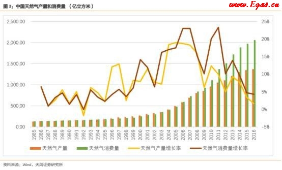 2016年中國天然氣消費(fèi)量2058億立方米,產(chǎn)量1368億立方米,供需缺口近700億立方米,對(duì)外依存度34%。自2014年起,中國天然氣的產(chǎn)量和消費(fèi)量增速均有所放緩,但消費(fèi)量的增速仍然持續(xù)大于產(chǎn)量的增速。隨著中國城鎮(zhèn)化過程中居民能源消費(fèi)結(jié)構(gòu)的變化,以及環(huán)保監(jiān)管日趨嚴(yán)格的背景下燃?xì)馓娲禾抗╇姽嵝枨蟮奶嵘?,天然氣下游消費(fèi)有進(jìn)一步增長的空間。開發(fā)國內(nèi)非常規(guī)天然氣、進(jìn)口管道氣、進(jìn)口LNG是解決中國天然氣供需缺口的三大主要途徑。