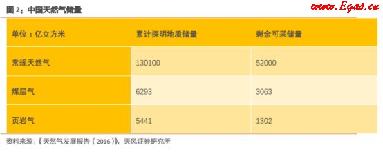 截至2015年底,全國累計(jì)探明常規(guī)天然氣地質(zhì)儲(chǔ)量13.01萬億立方米,剩余可采儲(chǔ)量5.2萬億立方米;累計(jì)探明煤層氣地質(zhì)儲(chǔ)量6293億立方米,剩余可采儲(chǔ)量3063億立方米;累計(jì)探明頁巖氣地質(zhì)儲(chǔ)量5441億立方米,剩余可采儲(chǔ)量1302億立方米。