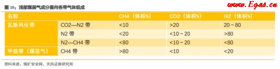 在接近地表的煤層內(nèi),原生的天然氣向上運移,離開煤層,地面空氣和地表的生物化學和化學反應所產(chǎn)生的氣體向下滲透,進入煤層,從而淺部煤層氣成分形成垂向分帶現(xiàn)象。一般自上而下可分為四個帶:二氧化碳—氮氣帶,氮氣帶,氮氣—甲烷帶,甲烷帶。采煤界將前三個帶統(tǒng)稱為"瓦斯風化帶",在"瓦斯風化帶"下的"甲烷帶"才是煤層氣的主要開采區(qū)域。具體如下表所示: