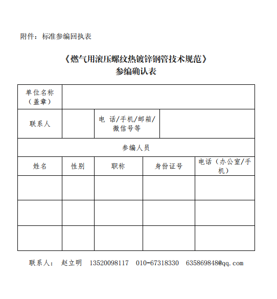 主要內容包括:滾壓螺紋技術壓制外管螺紋的熱鍍鋅鋼管的尺寸、外形、技術要求、實驗方法、檢驗規(guī)則、包裝、標志及質量證明書。為使本標準更具專業(yè)性和市場適用性,特邀請涉及滾壓螺紋工藝相關技術領域單位共同參與本標準的制定,請有意向參與的單位填寫附件中回執(zhí)表報名參編工作。