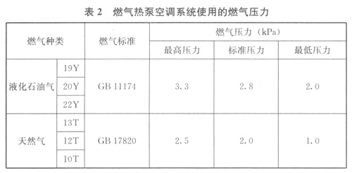 225現(xiàn)行國家標(biāo)準(zhǔn)《燃氣發(fā)動機驅(qū)動空調(diào)(熱泵)機組》GBT 22069—2008中第612條規(guī)定了燃氣熱泵空調(diào)機組使用的燃氣壓力如表2所示。
