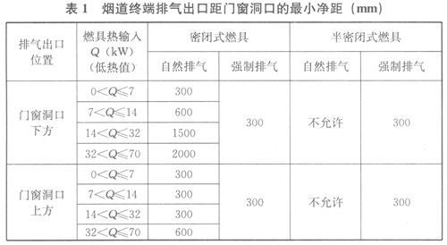 2我國住宅多數(shù)為多層或高層,多數(shù)燃具煙管高位安裝在本層門窗洞口上方,即安裝在上層住宅門窗洞口的下面了,故對上一層住宅的門窗洞口會有煙氣進入的問題產(chǎn)生。對居住房間(臥室和起居室)參照英、美標準進行了嚴格的安全間距規(guī)定(1.2~1.5)m,這與英、美單層住宅不同。