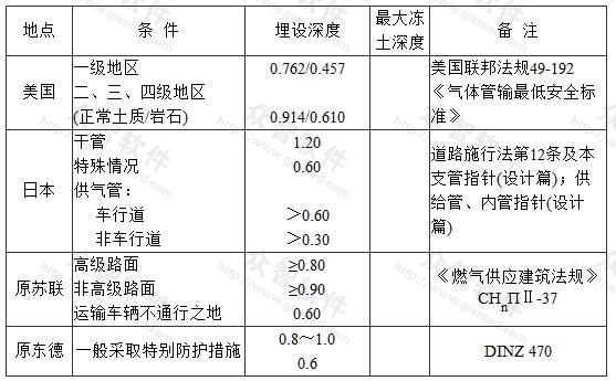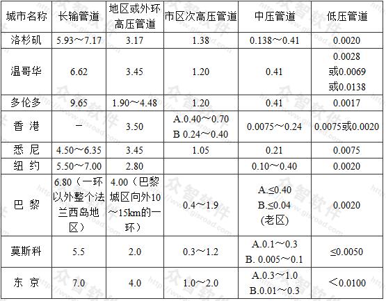 據(jù)西氣東輸長輸管道壓力工況,壓縮機出口壓力為10.0MPa,壓縮機進口壓力為8.0MPa,這樣從輸氣干線引支線到城市門站,在門站前能達(dá)到6.0MPa左右,為城鎮(zhèn)提供了壓力高的氣源。提高輸配管道壓力,對節(jié)約管材,減少能量損失有好處;但從分配和使用的角度看,降低管道壓力有利于安全。為了適應(yīng)天然氣用氣量顯著增長和節(jié)約投資、減少能量損失的需要,提高城市輸配干管壓力是必然趨勢;但面對人口密集的城市過多提高壓力也不適宜,適當(dāng)?shù)靥岣邏毫σ赃m應(yīng)輸配燃?xì)獾囊?,又能從安全上得到保障,使二者能很好地結(jié)合起來應(yīng)是要點。參考和借鑒發(fā)達(dá)國家和地區(qū)的經(jīng)驗是一途徑。一些發(fā)達(dá)國家和地區(qū)的城市有關(guān)長輸管道和城市燃?xì)廨斉涔艿缐毫η闆r如表23。
