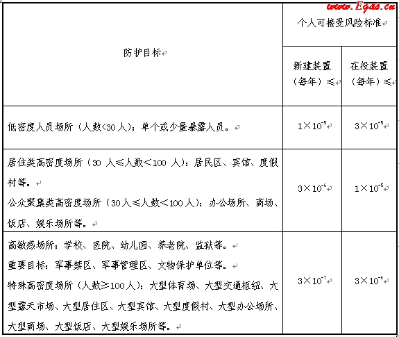 我國與歐美國家相比,可利用土地資源缺乏,人口密度高,危險(xiǎn)化學(xué)品生產(chǎn)儲(chǔ)存裝置密集,在確定風(fēng)險(xiǎn)標(biāo)準(zhǔn)時(shí),一方面要考慮提供充分的安全保障,另一方面要考慮稀缺土地資源的有效利用。因此對于普通民用建筑、一般居住場所的風(fēng)險(xiǎn)標(biāo)準(zhǔn)略寬松,但特殊高密度場所(大于100人)的風(fēng)險(xiǎn)標(biāo)準(zhǔn)較為嚴(yán)格。