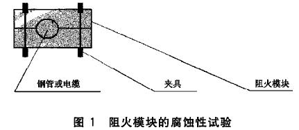 分別取長為250mm、外徑為Φ30mm~Φ40mm的Q235普通碳素結構鋼管兩根和長為250mm、外徑為Φ30mm~Φ40mm的PVC絕緣護套電纜3根,在阻火模塊上鉆出與鋼管和電纜直徑相同的孔洞,并對剖。將鋼管和電纜置于阻火模塊的孔洞中,并用夾具固定,固定方式見圖1。七天后,觀察鋼管和電纜外層膠皮與堵料試樣接觸部位是否出現(xiàn)銹蝕、腐蝕現(xiàn)象。