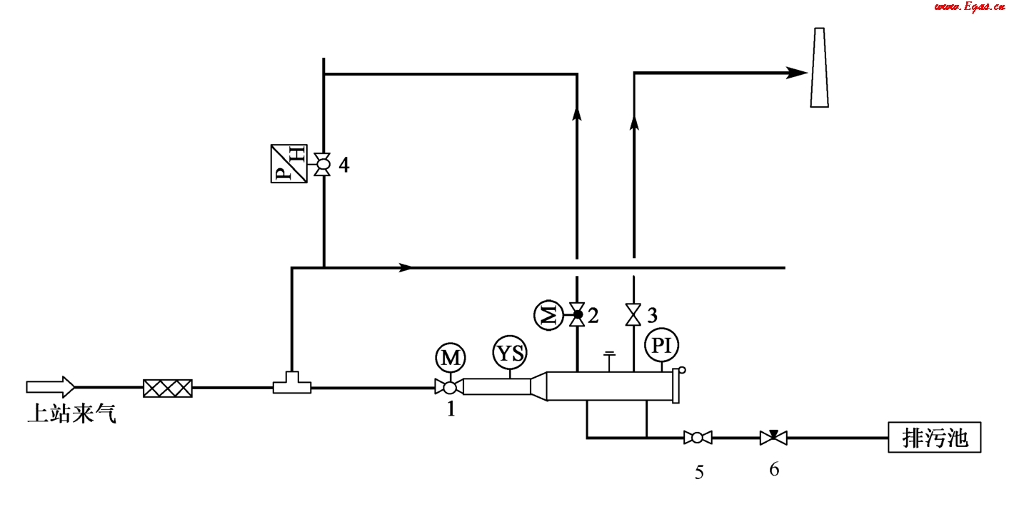 清管站的功能就是收發(fā)清管器。長(zhǎng)輸管道的清管作業(yè)有投產(chǎn)前清管和正常運(yùn)行期間清管。投產(chǎn)前清管的主要目的是清除管道內(nèi)雜質(zhì),主要包括施工期間的泥土、焊渣、水等。正常運(yùn)行期間的清管是指管道運(yùn)行一段時(shí)間后,由于氣體內(nèi)含有一定的雜質(zhì)積存在管線內(nèi),使管輸效率下降,對(duì)管線造成腐蝕等,因此需要對(duì)管線進(jìn)行清管。常見清管站工藝流程圖,如圖3-1所示。