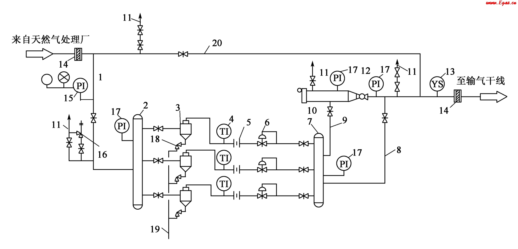 1—進(jìn)氣管;2,7—匯管;3—多管除塵器;4—溫度計(jì);5—流量計(jì);6—調(diào)壓閥;8—外輸氣管線;9—清管用旁通管;10—清管器發(fā)送裝置;11—放空管;12—球閥;13—清管器通過(guò)指示器;14—絕緣法蘭;15—電接點(diǎn)壓力表(帶聲光信號(hào));16—安全閥;17—壓力表;18—節(jié)流閥;19—排污管;20—越站旁通管