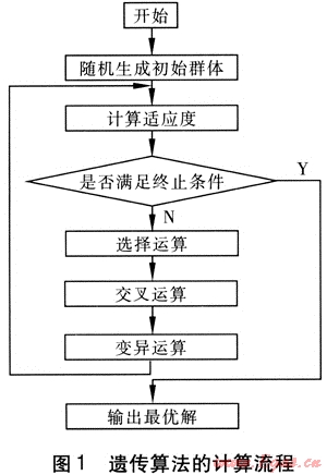 遺傳算法作為一種全局優(yōu)化搜索方法,以其簡單通用、魯棒性強(qiáng)、適于并行處理以及應(yīng)用范圍廣等特點,在求解復(fù)雜的工程優(yōu)化問題中取得了良好的效果。它是基于生物進(jìn)化的思想,將優(yōu)化計算中的迭代過程模擬成物種進(jìn)化的過程,形成一種具有“生成+檢驗”特征的搜索算法[5]。它以編碼空間代替問題的參數(shù)空間,以適應(yīng)度函數(shù)為評價依據(jù),以編碼群體為進(jìn)化基礎(chǔ),以對群體中個體位串的遺傳操作實現(xiàn)選擇和遺傳機(jī)制,建立起一個迭代過程,使遺傳算法具有了其他傳統(tǒng)優(yōu)化方法所沒有的特性。遺傳算法的計算流程見圖1。
