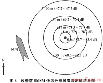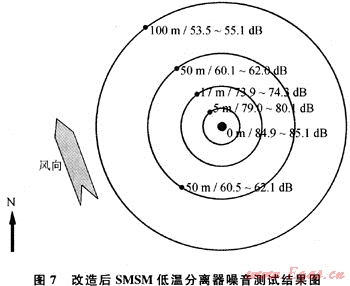 選擇改造前后SMSM低溫分離器處理量最大時、對噪音進行測試,結果見圖6、7。