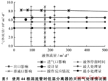 由圖5可知,在壓力為4.0MPa時,44根渦流管的處理量為(410~550)×104m3/d,由此看來造成外輸商品氣氣質不合格的主要原因是渦流管的數量不夠。