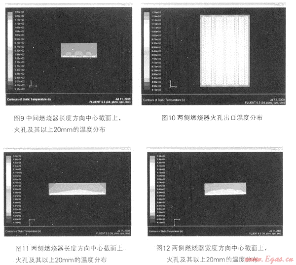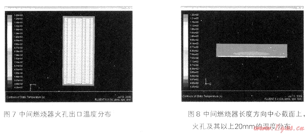 熱態(tài)數(shù)模計(jì)算得到了中間燃燒器和兩側(cè)燃燒器的火孔出口以及火孔以上20mm的溫度分布,見(jiàn)圖7到圖12。由圖中可以看出,無(wú)論是中間燃燒器,還是兩側(cè)燃燒器,火焰都比較均勻,火孔以上有約6mm高度的短火焰,很快燃燒完全,火焰溫度達(dá)到1000℃,與樣機(jī)試驗(yàn)的實(shí)際燃燒溫度相吻合。