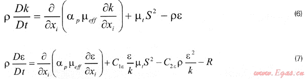 ,湍流動(dòng)量擴(kuò)散率ε=cDk3/2L,其中cD為無(wú)量綱的阻力系數(shù),L為特征長(zhǎng)度。根據(jù)Navier-Stokes方程,可導(dǎo)出κ和ε方程: