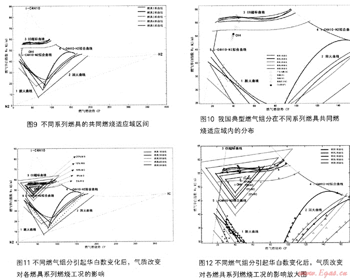 如前述圖3~8所示,以燃?xì)馊A白數(shù)顫、燃?xì)馊紵齽軨P兩個(gè)參數(shù),建立的坐標(biāo)圖形,可以得到比較平滑的脫火、回火及CO超標(biāo)等極限燃燒特性曲線,并可形成比較穩(wěn)定的燃?xì)饩哌m應(yīng)性封閉區(qū)域。