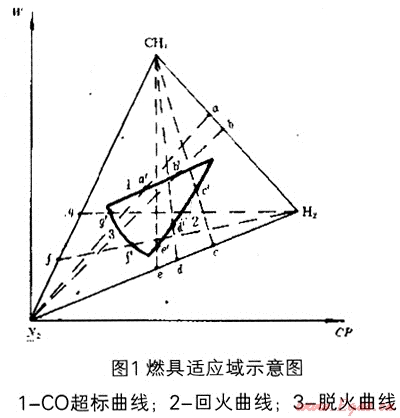 開發(fā)設(shè)計(jì)燃具時(shí),首先要決定使用某類燃?xì)狻8鶕?jù)某類燃?xì)獾幕鶞?zhǔn)氣[1]設(shè)計(jì)、生產(chǎn)后按照基準(zhǔn)氣及界限試驗(yàn)氣的要求(包括壓力)調(diào)整檢驗(yàn)出廠。當(dāng)燃?xì)庑再|(zhì)(成分)發(fā)生變化時(shí),其工作狀態(tài)必然改變。如果燃?xì)獬煞肿兓谀骋唤缦薹秶鷥?nèi),它仍能保持正常工作。這就是燃具對燃?xì)獬煞肿兓倪m應(yīng)能力,稱為燃具的適應(yīng)性。每個(gè)燃具都有一定的適應(yīng)能力。量化這個(gè)適應(yīng)能力,可以用燃具適應(yīng)燃?xì)獬煞肿兓姆秶鷣肀硎尽_m應(yīng)燃?xì)獬煞肿兓姆秶鷧^(qū)間稱為燃具適應(yīng)域。適應(yīng)域的范圍越寬,表示燃具的適應(yīng)燃?xì)鈿赓|(zhì)變化的能力越強(qiáng)[2]。