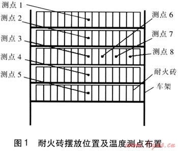 燃?xì)廨椛涓稍锔G的底部鋪設(shè)2道鋼軌,將耐火磚放置于小車架被推入窯中,在加熱過程中,耐火磚原地不動(dòng),吸收紅外輻射能量而升溫。耐火磚的擺放位置及溫度測(cè)點(diǎn)布置見圖1。