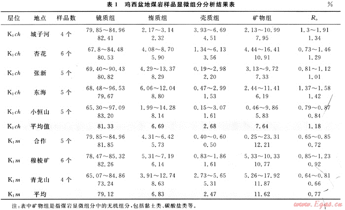 通常把煤中各種復雜的顯微有機組分按其性質(zhì)和成因劃歸3個組,即鏡質(zhì)組、殼質(zhì)組和惰質(zhì)組,以鏡質(zhì)組為主的腐殖煤形成的干酪根為腐殖型干酪根,通常是主要的生氣成分[2]。對雞西盆地8個礦區(qū)共40個樣本進行煤巖顯微組分分析(分析結果見表1),殼質(zhì)組含量很低,城子河組范圍值為0.15%~6.69%,均值為2.68%;穆棱組范圍值為0.40%~5.65%,平均值為2.47%;鏡質(zhì)組含量普遍大于70%,城子河組平均值為81.33%,穆棱組平均值為79.12%,所以煤層不具備生油的物質(zhì)基礎但具備良好的生氣條件。鏡質(zhì)組反射率(Ro)是確定有機質(zhì)成熟度的重要指標。城子河組煤巖樣本鏡質(zhì)體反射率的范圍為0.65%~1.91%之間,平均為1.18%,基本屬于肥、焦煤階段,穆棱組鏡質(zhì)體反射率的范圍為0.64%~1.23%之間,平均為0.77%,基本屬于氣、肥煤階段。兩個組有機質(zhì)演化均達到“低-中成熟”階段,處于“石油窗”內(nèi),可以大量生氣。
