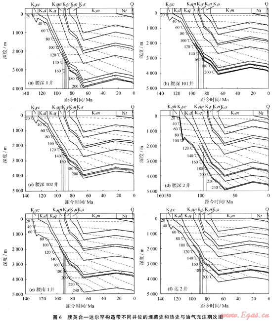 根據(jù)腰英臺構(gòu)造和達爾罕構(gòu)造部分井(腰深1井、腰深101井、腰深102井及達2井)的地層埋藏史、熱史(古地溫梯度)及流體包裹體均一化溫度資料綜合分析表明,腰英臺構(gòu)造帶油氣的成藏時間為距今93~84Ma,其中液態(tài)烴的充注高峰為距今93~89Ma,氣態(tài)烴的充注高峰為距今88~86Ma,由此表明油氣充注期為青山口組沉積后期至嫩江組末期(圖6-a、b、c);達爾罕構(gòu)造帶烴類充注為一期,充注時間為距今94~87Ma,為青山口組中期至嫩江組早期,達2井后期補充充注無機CO2,充注時間為距今85~81Ma,為嫩江組的后期至四方臺組早期,新近紀之后的產(chǎn)生的CO2為大規(guī)模的無機CO2的來源(圖6-d、e、f)。