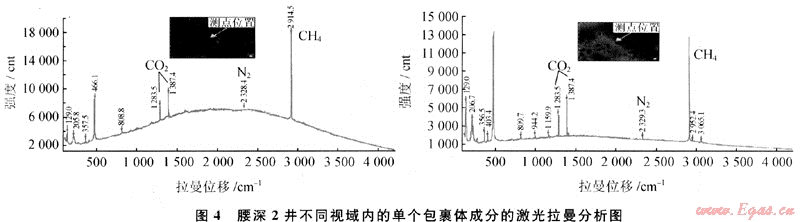 達爾罕構(gòu)造帶營城組天然氣中CO2的含量略高于營城組,如DB11井與達2井天然氣個別樣品CO2的含量接近30%左右,從天然氣同位素與組分的分析表明,CO2主要為無機成因氣。包裹體激光拉曼分析結(jié)果表明,腰深2井的包裹體主要包括CO2、N2以及甲烷(圖4),含有微量乙烯和甲苯。腰深2井、腰南1井和達2井營城組存在液態(tài)烴、氣態(tài)烴以及CO23類包裹體,均切穿于石英礦物的裂隙以及次生加大邊,為同一期形成的包裹體。根據(jù)上述3口井與烴類包裹體共生的鹽水包裹體均一化溫度分布直方圖分析表明(圖5-a),均一化溫度分布為123~159℃,油氣為一期充注,存在2個充注高峰,早期充注峰值為油氣的充注高峰,均一化溫度分布為123~135℃,后期峰值可能為C02充注高峰期,均一化溫度分布為147~159℃,并且此期均一化溫度分布區(qū)間明顯不同于達爾罕與腰英臺構(gòu)造帶的烴類的分布區(qū)間。此外,從單井鹽水包裹體的均一化溫度分布圖上可以看出(圖5-b、c、d),腰深2井與腰南1井主要為一期成藏,主要存在烴類包裹體成藏高峰,而達2井明顯不同于上述2口井,存在2個峰值,前峰值為烴類充注高峰,后峰值為CO2充注高峰,這與達2井天然氣組分中存在高含量的CO2的特征密切相關(guān)。