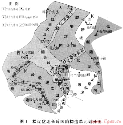 長嶺凹陷位于松遼盆地中央坳陷帶南部,是在古生界變質(zhì)基底上發(fā)育起來的斷、坳疊置的晚中生代碎屑巖盆地,其東部為華字井斷凸,南與西南隆起區(qū)毗鄰,西為西部斜坡區(qū)。腰英臺-達爾罕斷凸為位于長嶺凹陷帶內(nèi)的1個正向構(gòu)造單元,其東南部和西北部分別長嶺牧場次凹和乾安次凹2個生烴凹陷(圖1)。研究區(qū)構(gòu)造特征及演化總體表現(xiàn)為早期裂谷、中期坳陷、晚期褶皺的特點,經(jīng)歷了斷陷、坳陷和萎縮褶皺3個大的構(gòu)造演化階段,斷陷期伴隨有多次火山活動,使得該地區(qū)斷陷層廣泛發(fā)育火山巖體,而且長嶺斷陷層基底斷裂發(fā)育,斷陷延伸方向多為北北東向和北西向,是在古生代板塊或地塊(體)演化過程中形成的縫合帶或逆掩推覆斷裂系統(tǒng)的基礎(chǔ)上,經(jīng)過多次擠壓、走滑、伸展等不同方式的構(gòu)造活動改造形成的,為火山巖儲集層天然氣成藏的主控因素。長嶺斷陷層系包括登婁庫組、營城組、沙河子組與火石嶺組,地球化學(xué)資料表明斷陷層營城組天然氣主要來源于營城組、沙河子組以及火石嶺組,天然氣氣源充足;廣泛發(fā)育火山巖系儲集層,鉆井資料揭示營城組火山巖儲集層巖性主要為灰、灰綠色輝綠巖,玄武巖,安山巖及(裂隙發(fā)育)流紋巖,發(fā)育氣孔及杏仁構(gòu)造(充填物為方解石和硅質(zhì)),孔洞(氣孔)裂縫發(fā)育,并充填有方解石脈;登婁庫組和泉頭組可以作為區(qū)域性的蓋層,長嶺斷陷火山巖儲集層成藏條件十分優(yōu)越,勘探前景廣闊[15~18]。目前已在腰英臺深層構(gòu)造帶腰深1與長深1井營城組與達爾罕構(gòu)造帶獲得了工業(yè)氣流,其余井位也有天然氣氣流顯示。