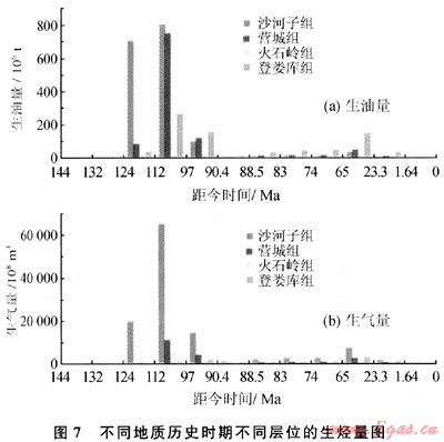 長嶺斷陷營城組和沙河子組烴源巖的生烴特征均表現(xiàn)為一次持續(xù)生烴,沙河子組烴源巖干酪根類型主要為腐殖型,以生氣為主,可能會有少量的原油生成,沙河子組烴源巖在登婁庫組的早期進入生油門限,但生油量很低,由于地層持續(xù)沉降,地溫變化快,登婁庫組后期開始進入生氣階段,至泉頭組中后期進入生氣高峰。營城組早期發(fā)生大規(guī)模的火山活動,主要以火山巖分布為主,烴源巖不甚發(fā)育,分布相對局限。如圖7所示,營城組與沙河子組在泉頭組沉積早期(距今110Ma左右)達到生油高峰,泉頭組的后期至青山口組沉積早期(距今105Ma左右)達到生氣高峰,青山口組沉積后期開始衰減,至距今90Ma左右生烴基本終止,與天然氣的成藏期較為匹配,而白堊紀末以后,生氣速率逐漸降低,至古近紀時期仍可補充部分天然氣,但是氣量較少,此時由于后期的構(gòu)造運動產(chǎn)生較多的CO2,充注至研究區(qū),形成了一些CO2與有機烷烴氣的混合氣藏。此外,長嶺斷陷深層早期形成的油藏和分散的液態(tài)烴,至白堊紀末以后溫度已達到裂解溫度(大于200℃)。中淺層有良好的蓋層封閉條件,早期形成的油氣沒有大規(guī)模損失破壞,后期演變?yōu)楣腆w瀝青,充填于巖石礦物的裂隙之間,對儲層成巖作用有重要的抑制作用。
