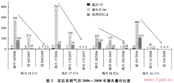 通過防漏、堵漏技術(shù)的應(yīng)用及方案的有效實(shí)施,防漏、堵漏工作取得了明顯效果(圖3),2007~2008年上鉆的滴西20、滴西21、滴西22、滴西171、滴西172、滴西173、滴西181、滴西182、滴西183、滴402、滴404、滴103、滴104、滴西25、滴西31井等井發(fā)生井漏的次數(shù)、漏失量及處理井漏耗費(fèi)時間均大幅度減少。