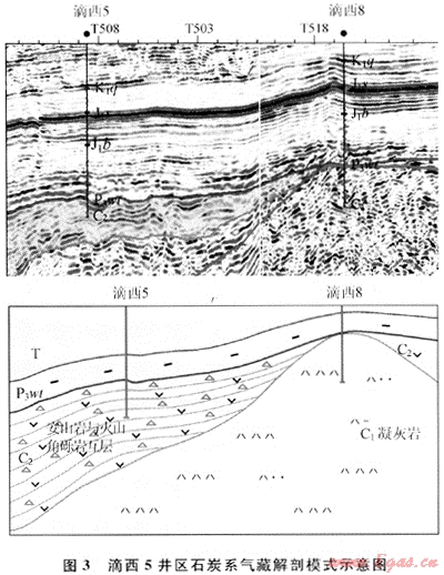 2006年通過(guò)井震結(jié)合對(duì)滴西5井區(qū)進(jìn)行了解剖,從巖性巖相變化模式確定滴西5和滴西8井區(qū)石炭系為不同的巖相巖體,認(rèn)為滴西5井以火山角礫巖為儲(chǔ)層,以安山巖為隔層,氣藏類(lèi)型為受火山巖(角礫巖)巖性控制的層狀地層氣藏,而不是以前認(rèn)識(shí)的構(gòu)造氣藏(圖3)。