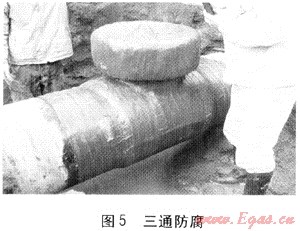 ④ 三通管件防腐使用從德國引進的新型防腐材料(見圖5),該材料具有創(chuàng)傷自動修復功能,使用方便、黏結(jié)優(yōu)異、抗陰極保護剝離性強;使用電火花檢漏儀100%檢查防腐層,合格后回填;