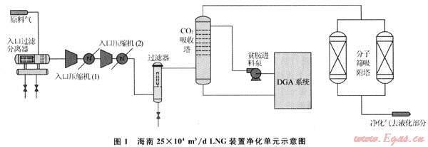 天然氣預處理系統(tǒng)包括過濾分離、增壓、二甘醇胺(DGA)脫CO2和分子篩干燥部分。流程簡圖見圖1。