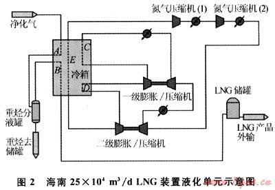 海南LNG工廠屬于小型的天然氣液化裝置,從工程投資、運行費用、裝置流程的簡便性、運行的靈活性、設備的數(shù)量等方面考慮,選擇改進的氮氣膨脹制冷工藝——氮氣二級膨脹制冷工藝。