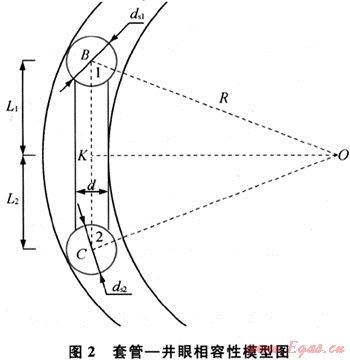 在采用常規(guī)下套管方法時,以套管串在井眼出現(xiàn)“硬卡”問題為臨界條件,建立套管、井眼幾何相容性模型(見圖2),其中B、C兩點是約束點,代表套管接箍或扶正器,兩個支點間是套管柱。在圖2中,R是長度為L(L=L1+L2)的套管柱可通過的最大井眼曲率半徑,在井眼直徑(Ds)、上下兩支點直徑ds1、ds2,套管外徑(d)給定前提下,可推導(dǎo)出套管柱所能通過的最大井眼曲率(K=1/R)。