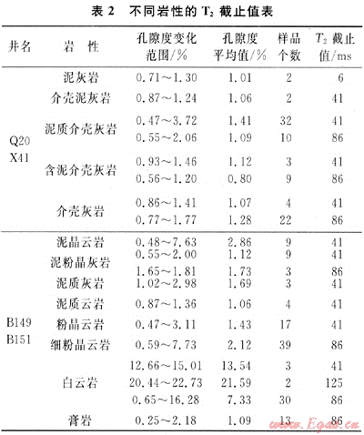 通過對(duì)216塊巖樣的T2截止值實(shí)驗(yàn),結(jié)果表明:孔隙度大小對(duì)R截止值影響沒有明顯的規(guī)律,泥質(zhì)含量高低與T2截止值有一定的統(tǒng)計(jì)規(guī)律,一般情況下,泥質(zhì)含量高的碳酸鹽巖的T2截止值一般較小(表2),普遍在41ms左右;而泥質(zhì)含量低,巖性較純的碳酸鹽巖的T2截止值普遍較泥質(zhì)含量高的巖樣的T2截止值高,在86ms左右。因此碳酸鹽巖地層核磁共振測井的T2截止值不應(yīng)是定值,它與泥質(zhì)含量成反比關(guān)系[6]。