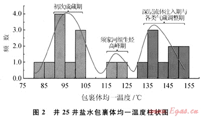 井25井須家河組儲(chǔ)層兩種鹽度值反映存在2種烴源產(chǎn)物,其中第一種較低鹽度(NaCl質(zhì)量分?jǐn)?shù)為6.6%~8.0%)對應(yīng)較高的均一溫度范圍(115~150℃),應(yīng)為演化程度較高的油氣所伴生;第二種較高的撲度(NaCl質(zhì)量分?jǐn)?shù)為21.8%~22.1%)和較低均一溫度范圍(82~102℃),是剛進(jìn)入大量生烴階段的產(chǎn)物(表1)。統(tǒng)計(jì)井25井須家河組儲(chǔ)層與烴類包裹體伴生的鹽水包裹體均一溫度,繪制包裹體均一溫度柱狀圖(圖2),可見均一溫度存在3個(gè)主要峰溫,對應(yīng)3個(gè)溫度范圍:90~105℃、115~125℃以及130~155℃。