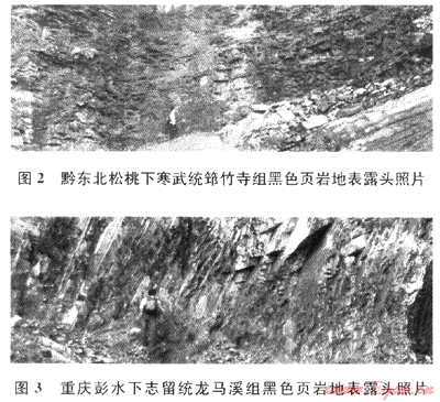 從地表頁巖出露情況分析認(rèn)為,筇竹寺組黑色頁巖(圖2)主要分布于川南的宜賓-瀘州、川東的達(dá)州-墊江-長(zhǎng)壽一帶和黔北的金沙-江口-松桃一線以南地區(qū),渝東南的秀山、酉陽和湘鄂西的龍山、咸豐等地區(qū)也較為發(fā)育;五峰組-龍馬溪組筆石頁巖(圖3)主要發(fā)育于盆地邊部且相對(duì)穩(wěn)定,在川南的宜賓、瀘州、南川、綦江,川東的石柱、涪陵,渝東南的武隆-彭水-黔江,黔東北的道真-德江及鄂西的利川-咸豐-來鳳一帶發(fā)育完整,而在盆地腹部的樂山-龍女寺一線以西北,由于后期構(gòu)造抬升剝蝕而缺失。以上2套黑色頁巖熱演化程度普遍較高且已被證實(shí)為重慶及其周緣地區(qū)海相地層的主要?dú)庠磶r[16]。