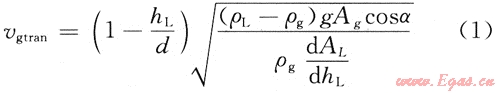 當來流為段塞流時,進入捕集器后轉化為分層流,根據(jù)Taitel和Dukler的轉變準則判斷,可以計算出一定傾角下,滿足流型轉化的管徑D,詳見公式(1):