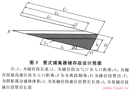 式中:D為管徑;l2為儲存段液位沿管長長度;β為分離段傾角;VL為液體體積。列出一系列管徑及管根數(shù)并循環(huán)計算,當L5<L2時計算得到的結果為捕集器的初步設計尺寸。