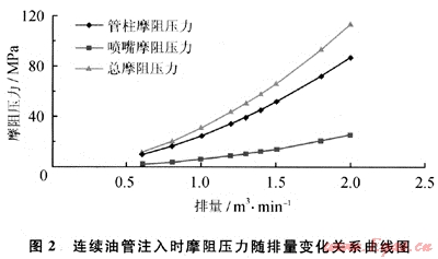 2) 環(huán)空注入。環(huán)空注入壓裂是在地層破裂后通過油管、套管環(huán)空注入攜砂液進(jìn)行后續(xù)作業(yè),同時(shí)降低(或關(guān)閉)連續(xù)油管排量進(jìn)行井底壓力檢測。環(huán)形空間的流動通道遠(yuǎn)遠(yuǎn)大于連續(xù)油管,同時(shí)由于攜砂液不再流經(jīng)噴嘴而不存在節(jié)流摩阻,從而大大降低了摩阻損失,具體計(jì)算結(jié)果見圖3。即使排量為8m3/min,3000m管柱環(huán)空摩阻也僅為16MPa左右,排量較低時(shí)基本可以忽略摩阻影響,這為大排量施工奠定了基礎(chǔ)。