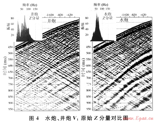 一般情況下,使用多級檢波器采集VSP數(shù)據(jù)時,“井炮”激發(fā)的能量比“水炮”強、一致性比“水炮”好,主頻比“水炮”高、抗低頻的能力較“水炮”強,變“水炮”為“井炮”是提高原始資料品質(zhì)的一種有效途徑。