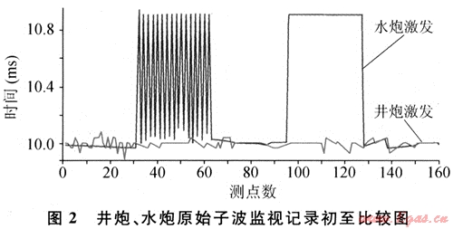 初至時間是VSP資料所包含的一個重要參數(shù),它是從VSP資料中提取地層速度信息以及VSP波場分離的前提。從理論上講,震源子波的初至時間是嚴格一致的。而實際上并非如此,炸藥震源的時間不一致現(xiàn)象更為明顯。其原因主要是炮井位置的改變、激發(fā)深度的變化、井中激發(fā)環(huán)境的變化等。對本次試驗的水炮、井炮激發(fā)來說也不例外。每炮間初至的變化幅度越小則說明震源的一致性越好。圖2為水炮、井炮子波監(jiān)視記錄的初至比較圖。從圖中可以看出,井炮變化幅度在0.2ms左右,而水炮的變化幅度在1ms左右,這說明井炮的初至一致性比水炮的一致性好。