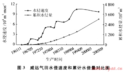 圖3是在滿足最優(yōu)擬合偏差函數(shù)最小時(shí),在水侵動態(tài)分析和生產(chǎn)動態(tài)數(shù)據(jù)的基礎(chǔ)上得到的水侵速度和累積水侵量與生產(chǎn)時(shí)間的關(guān)系。水侵速度呈臺階式上升,這和開采階段密切相關(guān)。