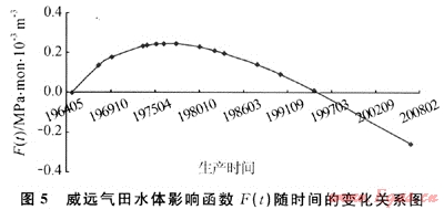 另一方面,從函數(shù)F(t)隨時(shí)間的變化關(guān)系曲線(圖5)可知,在威遠(yuǎn)氣田開井投產(chǎn)初期,由于采氣速度高、底水沿裂縫竄進(jìn)侵入氣藏、水體能量表現(xiàn)為逐漸增大;在進(jìn)入生產(chǎn)中期時(shí),水體的彈性能量開始逐漸減弱,水體的膨脹程度開始逐漸減小,進(jìn)入生產(chǎn)末期后,使函數(shù)F(t)形成一種持續(xù)下降甚至為負(fù)值,表明隨著水體能量的大量釋放以及受威遠(yuǎn)氣田大面積關(guān)井影響,部分地層水有可能出現(xiàn)沿大裂縫系統(tǒng)回退的現(xiàn)象,說明整個(gè)水體能量表現(xiàn)為具有可排性,如果在合適的位置打排水井大量排水,可使氣藏的采收率得到大幅度地提高。