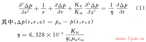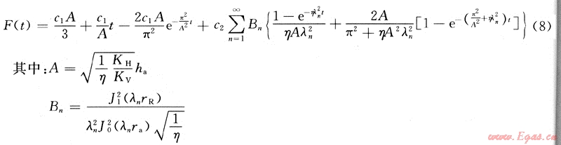 △p為壓降,MPa;pai為水層原始地層壓力,MPa;△pv為變壓降,MPa;η為水層擴(kuò)散常數(shù);r為徑向空間變量,m;z為垂向空間變量,m;KV為水層垂向滲透率,10-3μm2;KH為水層水平方向滲透率,10-3μm2;t為時(shí)間,mort;φa為水層孔隙度,小數(shù);μw為地下水黏度,mPa·s;cea為水體有效壓縮系數(shù),MPa-1;ha為水體厚度,m;qx為氣水界面處定流量,m3/mon;qv為氣水界面處變流量,m3/mon;rR為氣層半徑,m;ra為水層半徑,m;We為累計(jì)水侵量,m3。