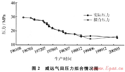 根據(jù)計(jì)算得到的儲量值,可得到威遠(yuǎn)氣田最優(yōu)擬合數(shù)據(jù)及壓力擬合情況(圖2、表2)。