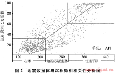 為保證震控的精確性,首先進行各種地震數(shù)據(jù)體與測井沉積微相相關(guān)性分析,優(yōu)選能夠較好區(qū)分沉積微相的地震數(shù)據(jù)體。通過井-震數(shù)據(jù)分析發(fā)現(xiàn):地震伽馬反演數(shù)據(jù)體與沉積微相具有很好的相關(guān)性[4](圖2),該數(shù)據(jù)體可用來做井間震控約束。