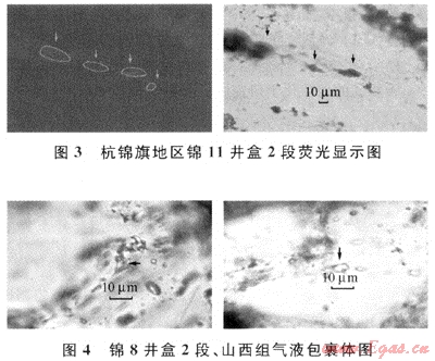 測試結(jié)果表明,包裹體絕大多數(shù)屬于氣液兩相包裹體,個別探井存在含油包裹體,顯微鏡下有明顯的熒光現(xiàn)象(圖3)。宿主礦物為石英,一般在裂縫中成串分布(圖4),形態(tài)不規(guī)則,大小為2~4μm,氣液比較低,一般在5%左右,包裹體顏色主要呈黑色或無色(占絕對優(yōu)勢)。包裹體鹽度基本上反映了地質(zhì)歷史時期包裹體形成時水介質(zhì)的含鹽度。本區(qū)上古生界古鹽度分布在0~8%,表明當(dāng)時研究區(qū)沉積水古鹽度比較淡,屬于潮濕環(huán)境。