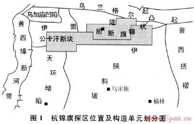 杭錦旗探區(qū)(包括杭錦旗區(qū)塊和杭南區(qū)塊)位于鄂北,橫跨伊盟隆起和伊陜斜坡兩大一級構(gòu)造單元,總面積為9825km2。根據(jù)基底頂面起伏、蓋層發(fā)育情況以及構(gòu)造形態(tài)特征,該區(qū)又可劃分為烏蘭格爾凸起、公卡漢凸起、杭錦旗斷階、伊陜斜坡及天環(huán)向斜一角等5個次一級構(gòu)造單元(圖1)[20~21]。在地形特征上,杭錦旗探區(qū)是鄂北地區(qū)長期繼承性古隆起,被認(rèn)為是鄂北油氣運移的有利區(qū)。