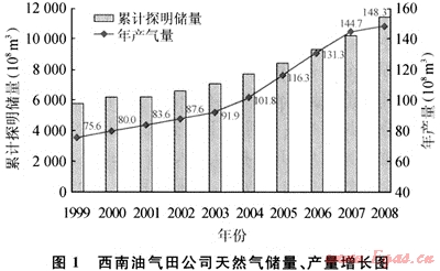 川渝地區(qū)天然氣工業(yè)始于20世紀(jì)50年代。1999年中國石油重組改制并在境外上市,西南油氣田公司(以下簡稱公司)負(fù)責(zé)川渝地區(qū)天然氣勘探開發(fā)業(yè)務(wù)。經(jīng)過10年(1999~2009年)的艱苦奮斗,天然氣勘探屢獲重大突破,儲量快速增長,天然氣開發(fā)成果卓著。新建產(chǎn)能120×108m3/a(超過過去20年的建設(shè)總量),地面輸配氣能力達(dá)200×108m3/a,天然氣凈化能力達(dá)146×108m3/a,2004年天然氣產(chǎn)量突破100×108m3,2006年油氣當(dāng)量突破一千萬噸大關(guān),成為國內(nèi)首個以天然氣生產(chǎn)為主的千萬噸級大油氣田。天然氣產(chǎn)量從1999年的75×108m3上升到2008年148×108m3,翻了近一番,年均增長10%(如圖1)。10年累計(jì)生產(chǎn)天然氣1060×108m3,占近50年總計(jì)產(chǎn)量的39%,天然氣開發(fā)實(shí)現(xiàn)了跨越式大發(fā)展。