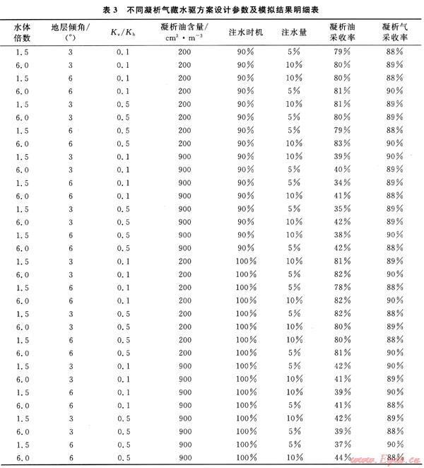 在前面凝析氣藏水驅(qū)方案確定之后,利用Eclipse數(shù)值模擬軟件的組分模擬器E300對(duì)其進(jìn)行了模擬運(yùn)算,其結(jié)果見表3。
