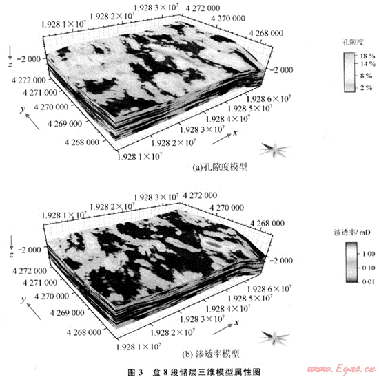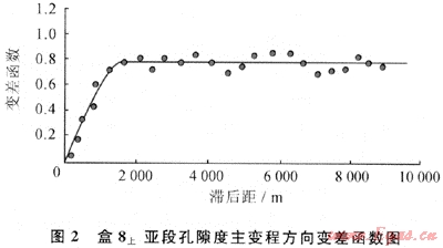 從表2中可以看出:由于盒8上亞段儲(chǔ)層和盒8下亞段儲(chǔ)層分別為曲流河和辮狀河沉積相,其儲(chǔ)層屬性的變差函數(shù)存在較大的差異。以孔隙度為例,雖然二者的主變程方向都為近于南北向,并且都可以用指數(shù)模型進(jìn)行擬合,但盒8上亞段儲(chǔ)層變差函數(shù)的主變程是1645m,而盒8下亞段儲(chǔ)層是819m,說明盒8上亞段儲(chǔ)層孔隙度沿主變程方向連續(xù)性更好。但是盒8上亞段儲(chǔ)層孔隙度次變程為425m,比盒8下亞段儲(chǔ)層孔隙度次變程503m要短68m,說明盒8上亞段儲(chǔ)層孔隙度側(cè)向變化比盒8下亞段快。二者的垂直變差函數(shù)分別為7.8m和6m,說明孔隙度在垂直方向上變化遠(yuǎn)比平面方向變化快,也就是說,儲(chǔ)層的垂直方向的非均質(zhì)性遠(yuǎn)強(qiáng)于平面非均質(zhì)性。盒8上亞段與盒8下亞段儲(chǔ)層滲透率變差函數(shù)具有相似的變化規(guī)律,只是主變程和次變程都比孔隙度小,說明滲透率在各方向的變化都比孔隙度快,反映儲(chǔ)層滲透率的非均質(zhì)性比孔隙度強(qiáng)。由此可見,準(zhǔn)確變差函數(shù)的求取,可有效反映儲(chǔ)層非均質(zhì)性大小及方向。