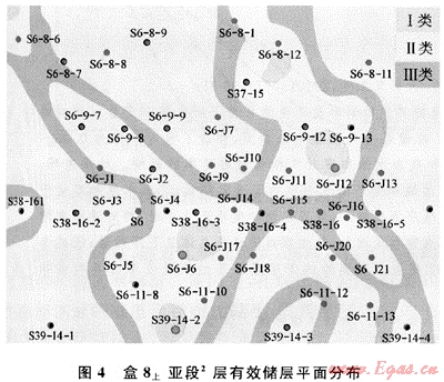 由于儲(chǔ)層屬性模型提供了空間任意位置孔隙度、滲透率的變化,所以可以準(zhǔn)確地預(yù)測(cè)有效儲(chǔ)層的空間分布。如圖4所示為盒8上亞段2層有效砂體平面分布預(yù)測(cè)結(jié)果。依據(jù)儲(chǔ)層孔隙度和滲透率的大小,可以將盒8段儲(chǔ)層砂體分為以下3類。