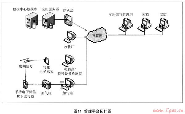 該系統(tǒng)可實(shí)現(xiàn)改裝信息、氣瓶信息、檢驗(yàn)信息、車輛信息和加氣信息的集成,實(shí)現(xiàn)對(duì)CNG改裝車輛的實(shí)時(shí)監(jiān)控;實(shí)現(xiàn)對(duì)CNG車輛加氣前的身份識(shí)別,打擊非法改裝、杜絕給不合格車輛和氣瓶加氣,如圖2。
